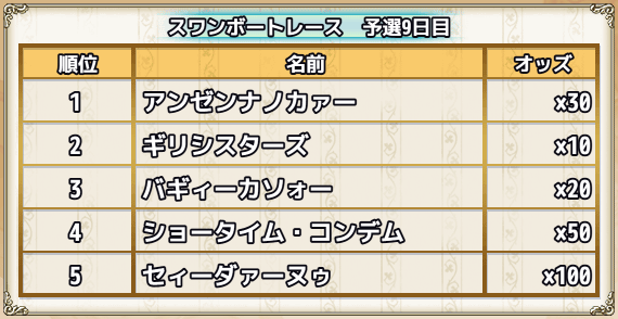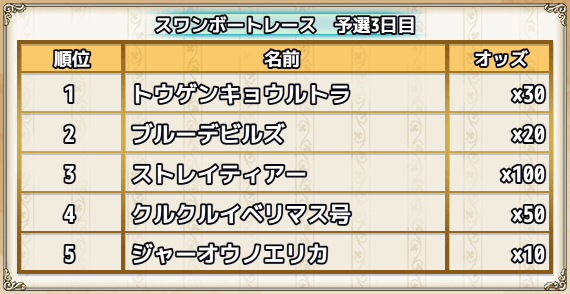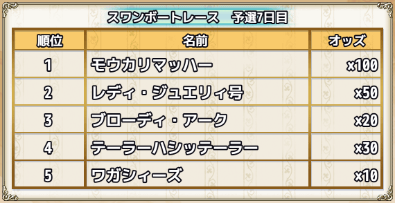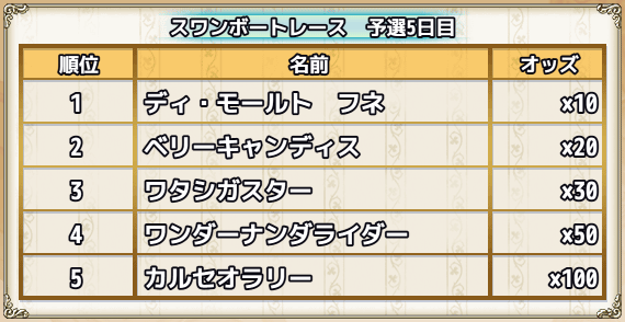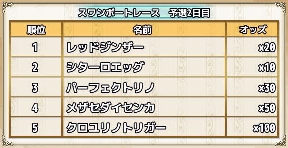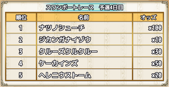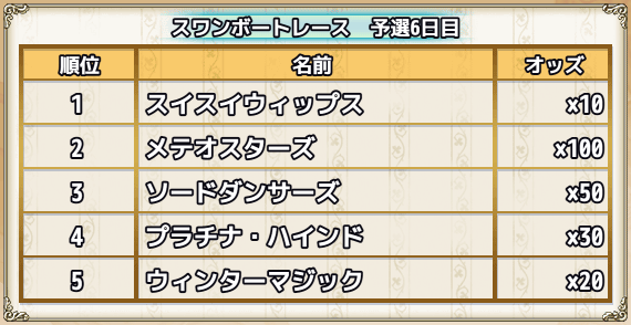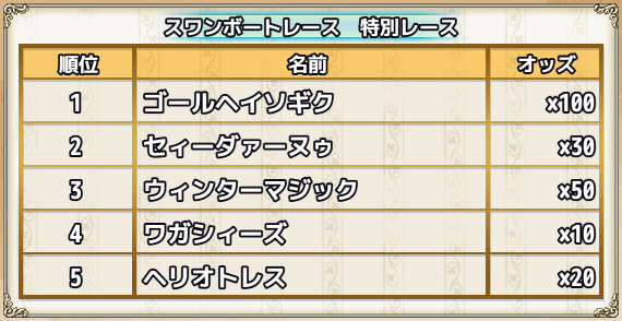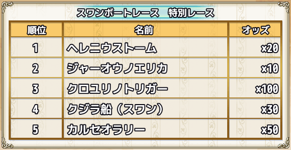 | スキップチケット×15 | 0 | 0 | 0 | 0 | 0 | 1(スワンちゃんオブジェ×1000) | スワンズ・ティアー×100 |