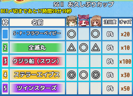 | 2024/3/19(火)12:00 | 予選1日目 | SGII お久しぶりカップ | 1000 |