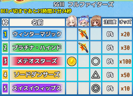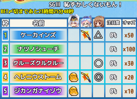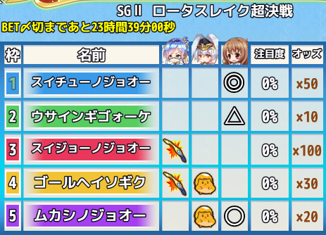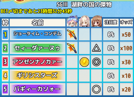 予選レース、特別レースに合計で100ベット以上を賭けると参加賞としてアイテムを獲得できます。