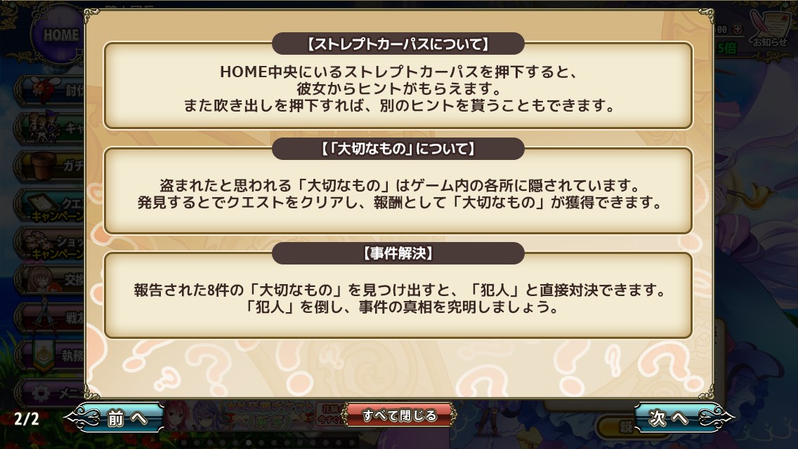 ![]() | 「大切なもの」 No.7 ラベンダーの団長の○○○○○○ ストレプトカーパスのヒント 「カラクリ無限城……ふふ、見るからに事件のニオイがプンプンしてくる。きっと奥深くに何か隠された真実があるはずさ」 「大切なもの」の隠し場所 「討伐」→カラクリ無限城→「イベント回想」画面を開くと「?」ボタンが増えているので、これをクリック。 |