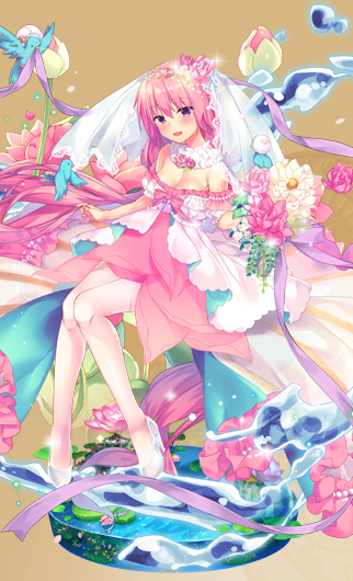 | 初登場 | ロータスレイク水中都市の女王……ハスである。 ……などと、肩書でも名乗らねば、どうにもむず痒い。 ……然り、カキツバタに無理矢理着せられてしまった。 似合っていると興奮してはいたのだが……ふぅ。卿、笑ってくれるなよ? |