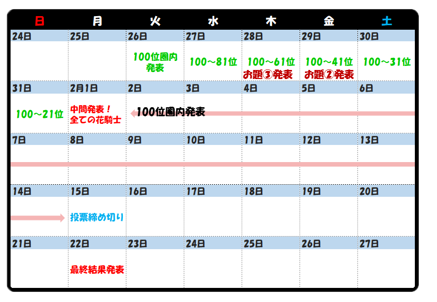 new!:お題③対象花騎士、↑↑:万華祭101位以下の花騎士。初入:今回総合100位内初の花騎士、最高:今回の確定順位の最高値