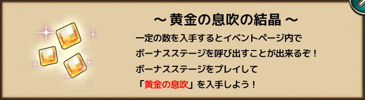 - 「黄金の息吹の結晶」20個で特殊召喚できるオキタエールを多く獲得できるボーナスステージ。