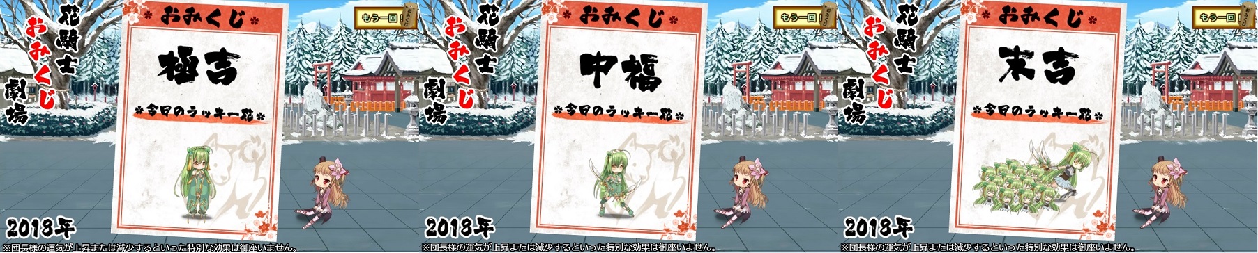 | 【期間限定】お正月① | 団長さん、あけましておめでとうございます。今年も毎日努力して、少しでも害虫のいない世界に近づくように頑張っていきたいと思います。 私なんかじゃ力不足かもしれないですけど、でも団長さんがいれば大丈夫な気がするんです。今年もよろしくお願いしますね。 |