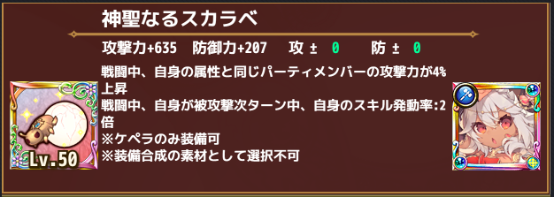 | 装備効果 | 戦闘中、自身の属性と同じパーティメンバーの攻撃力が4%上昇 | ||||||||||