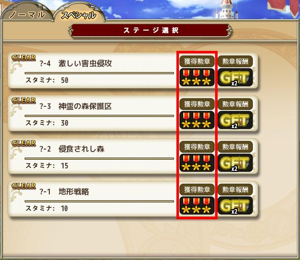| 勲章報酬 | 消費スタミナ | 経験値(経験値効率) | 宝箱の数 | ゴールド | 種 | ドロップ | 備考 |
