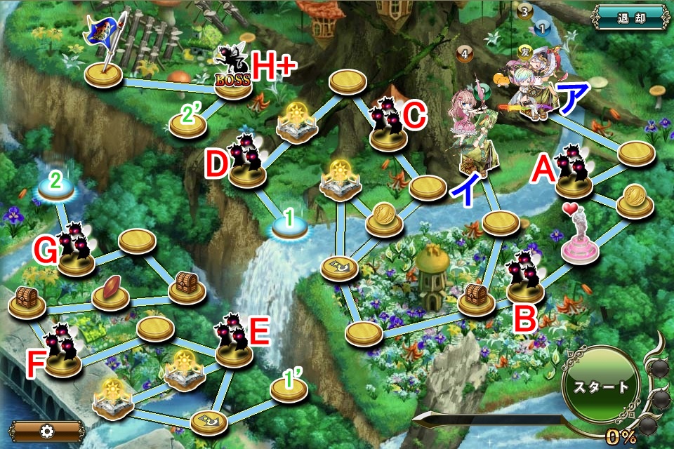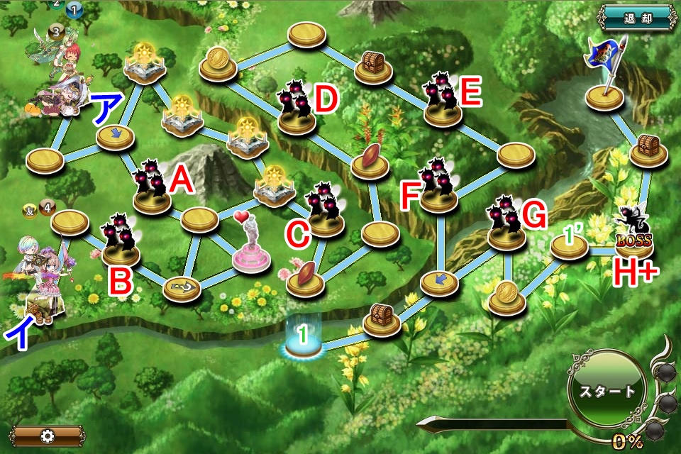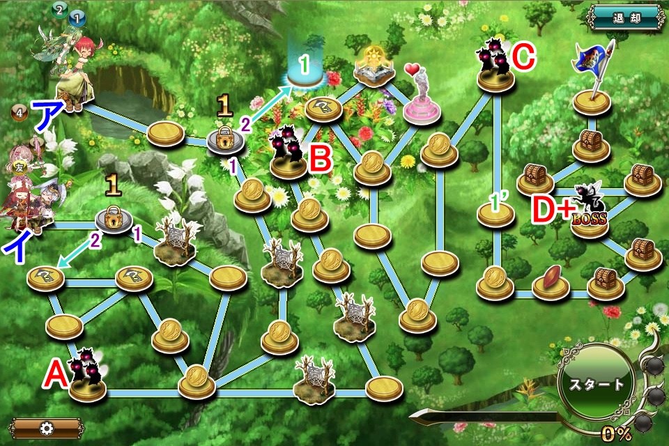 - 最少PTで狙う場合はアに1部隊、残り1部隊は適当に配置