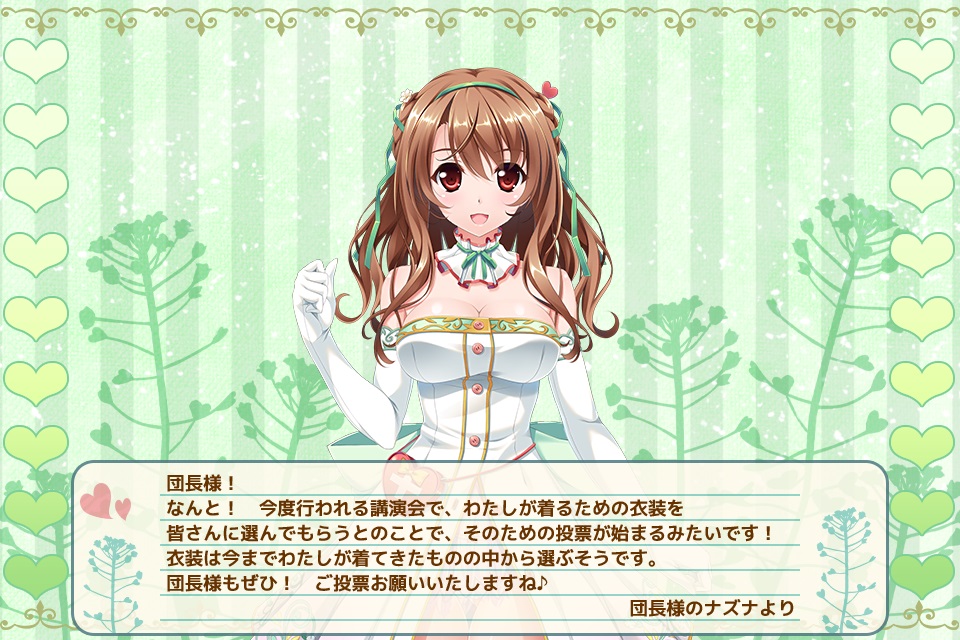 | フラワーナイトガールで団長補佐としてゲームのナビゲーションをしているナズナと申します♪ 団長様が快適に冒険できるよう一生懸命サポートしていきますので応援よろしくお願いします! まだ出会ったことのない方の騎士団長就任も楽しみに待っています。 (ゲームキャラクター総選挙2015より) | |||