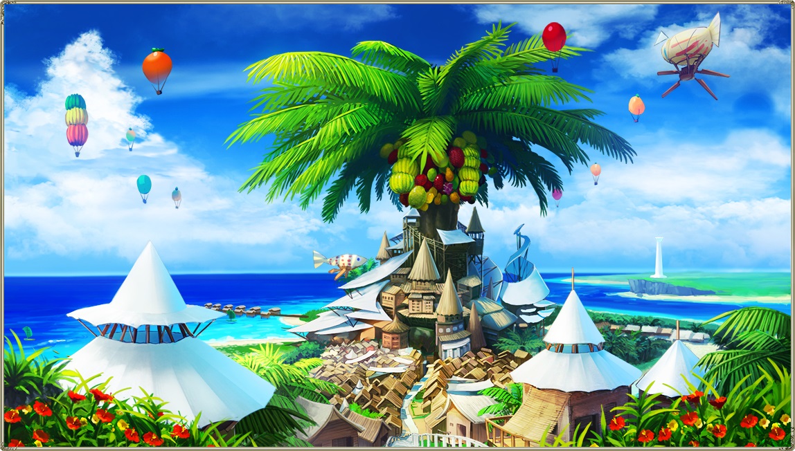 | 常夏の世界花。 太い幹と大きな葉が特徴で、この日陰で中心街は比較的過ごしやすい。 一年中続く真夏のような気温と陽気な国民性で常に賑わいを見せ、 毎日のようにお祭り事が開催されている。 特に世界花が実をつける夏季は盛大に盛り上がり、観光客も多く訪れる。 |