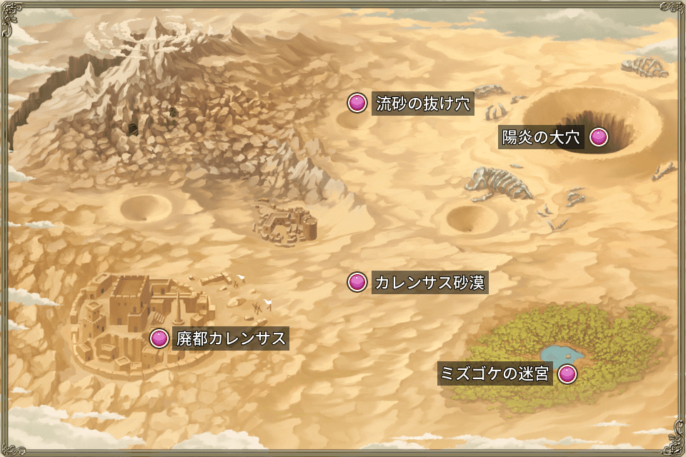 | カレンサスの大半を占める灼熱の砂漠。 動物も植物もほとんど存在しないが、 時々、様々な理由でカレンサスの人々が放浪するという。 そのタイミングを狙い、悪魔憑きと呼ばれる害虫が姿を現すことも……。 |