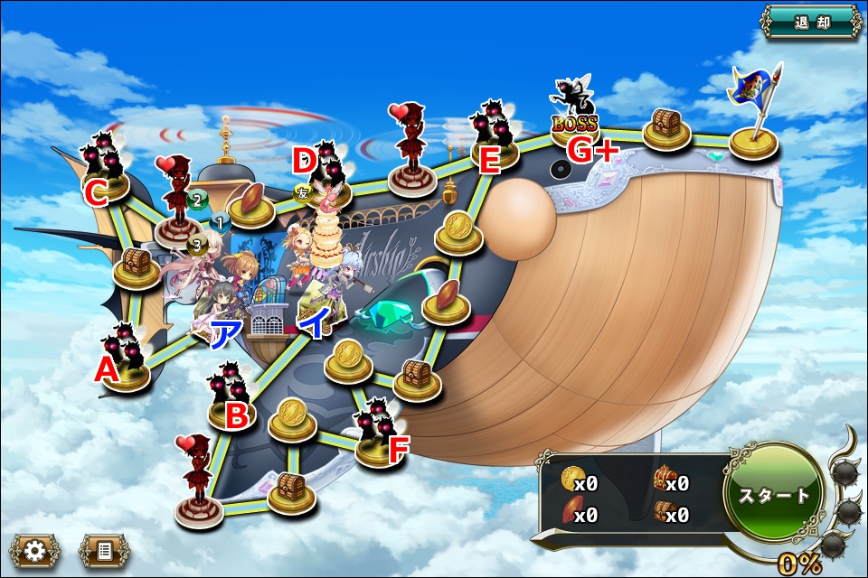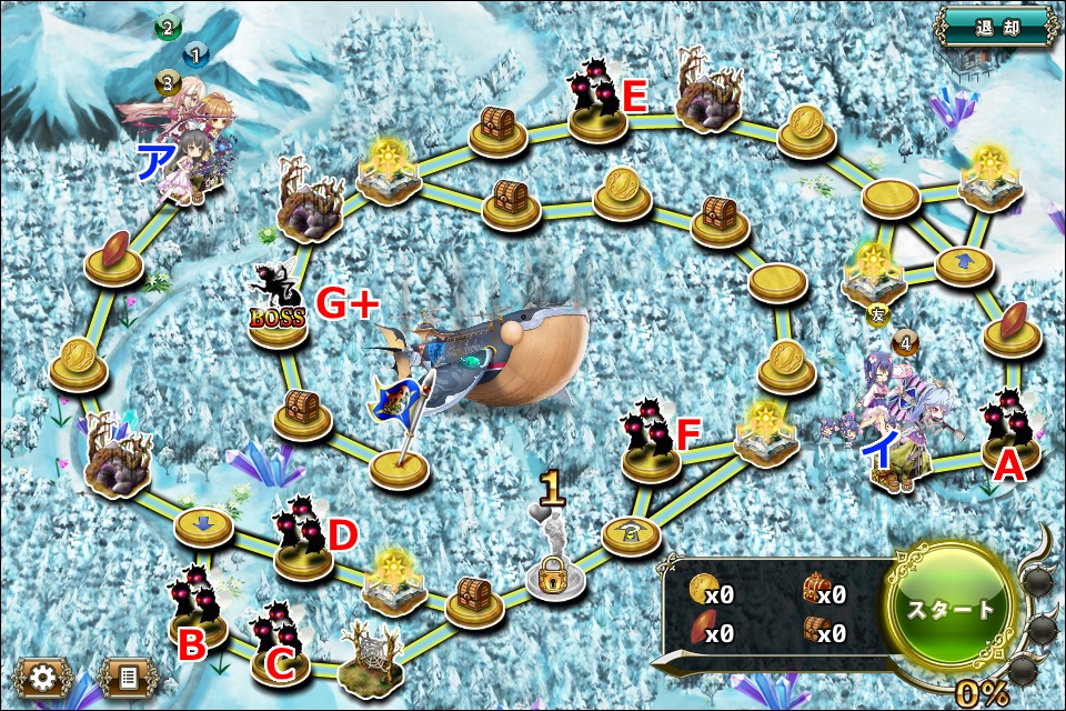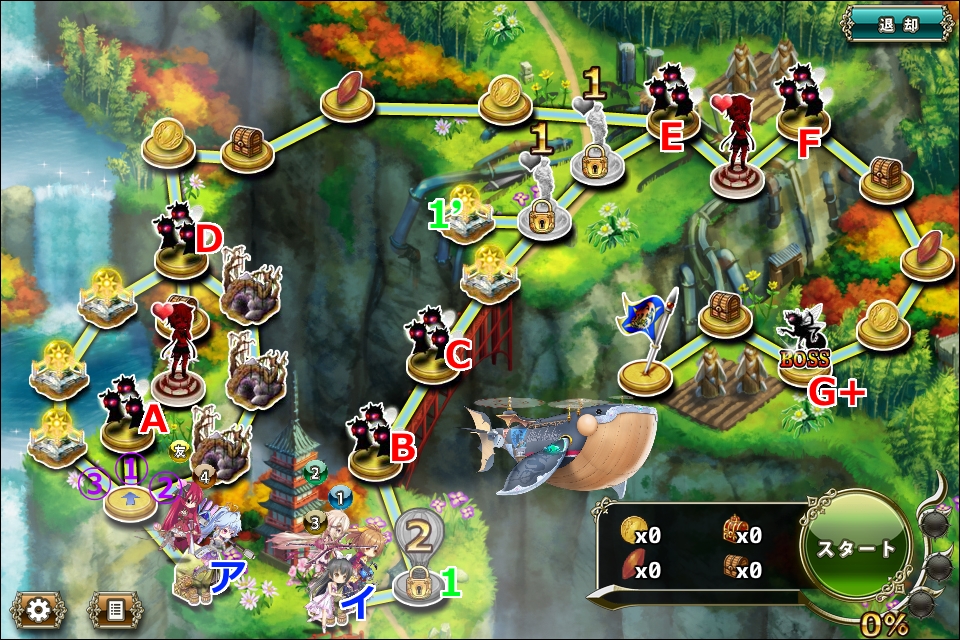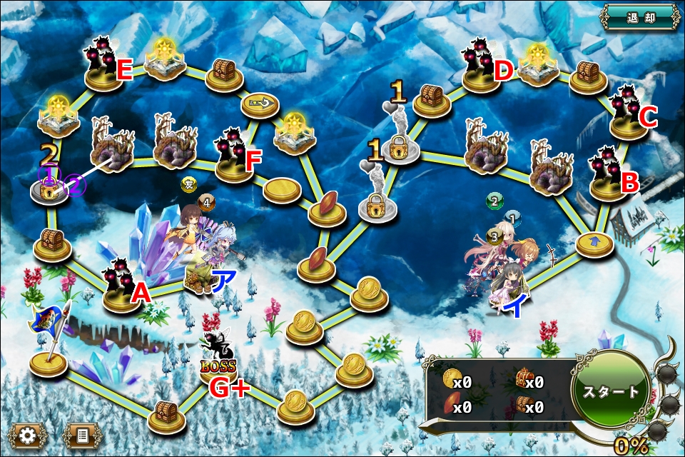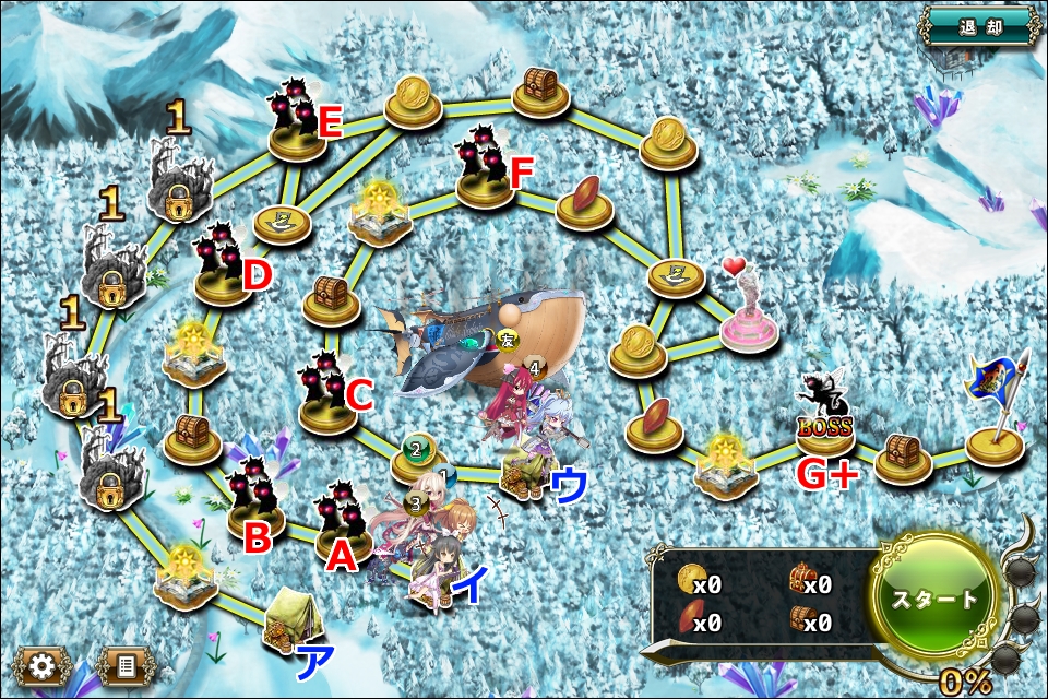 - Fに確実に接触するためにはア拠点に4部隊必要だが、その場合ア分岐ルートかイ拠点出発組を友軍に頼る必要がある。