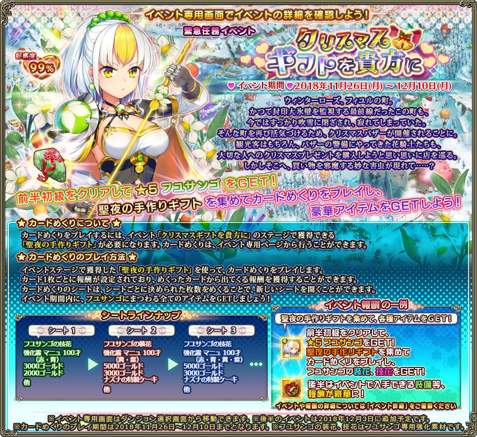 | フユサンゴの技花 | 1回 | フユサンゴの装花 | 1回 | フユサンゴの技花 | 1回 | プレミアムガチャチケット | 1回 | ★4 温もりの指輪 | 1回 | | 黄のマニュ100才 | 2回 | 赤のマニュ100才 | 1回 | 攻のアンプルゥ | 2回 | 攻のアンプルゥ | 2回 | 指輪オキタ(金) | 1回 | | 紫のマニュ100才 | 2回 | 青のマニュ100才 | 1回 | 守のアンプルゥ | 2回 | 赤のマニュ20才 | 3回 | 守のアンプルゥ | 2回 | | 黄のマニュ20才 | 2回 | 黄のマニュ100才 | 1回 | 命のアンプルゥ | 2回 | 赤のブルム100才 | 2回 | 青のマニュ20才 | 3回 | | 紫のマニュ20才 | 2回 | 紫のマニュ100才 | 1回 | 耳飾りオキタ(銀) | 1回 | 中級装備ガチャ種×500 | 3回 | 青のブルム100才 | 2回 | | 耳飾りオキタ(銀) | 1回 | 指輪オキタ(銀) | 1回 | 腕輪オキタ(銀) | 1回 | 中級装備ガチャ種×100 | 1回 | 中級装備ガチャ種×500 | 3回 | | 腕輪オキタ(銀) | 1回 | 首飾りオキタ(銀) | 1回 | 耳飾りオキタ(銅) | 1回 | ガチャ種×500 | 2回 | 指輪オキタ(銀) | 2回 | | 20000ゴールド | 1回 | 指輪オキタ(銅) | 1回 | 腕輪オキタ(銅) | 1回 | 5000ゴールド | 5回 | ガチャ種×500 | 2回 | | 10000ゴールド | 2回 | 首飾りオキタ(銅) | 1回 | 5000ゴールド | 7回 | クリスマスの贈り物(ランダム) | 4回 | 5000ゴールド | 4回 | | 3000ゴールド | 3回 | 中級装備ガチャ種×100 | 3回 | 3000ゴールド | 1回 | 秘密のプレゼント | 1回 | クリスマスの贈り物(ランダム) | 2回 | | 聖夜のケーキ | 1回 | 20000ゴールド | 1回 | 2000ゴールド | 1回 | ナズナ特製ケーキ | 2回 | 聖夜の勲章 | 2回 | | 聖夜の宝石 | 1回 | 5000ゴールド | 1回 | クリスマスの贈り物(ランダム) | 3回 | 絆水晶×10 | 10回 | ナズナ特製ケーキ | 2回 | | 聖夜の勲章 | 2回 | 3000ゴールド | 1回 | 聖夜の勲章 | 4回 | | | 絆水晶×10 | 10回 | | ナズナ特製ケーキ | 2回 | 2000ゴールド | 1回 | ナズナ特製ケーキ | 1回 | | | | | | 絆水晶×10 | 2回 | クリスマスの贈り物(ランダム) | 3回 | 絆水晶×10 | 8回 | | | | | | | 聖夜の勲章 | 4回 | | | | | | | | | ナズナ特製ケーキ | 1回 | | | | | | | | | 絆水晶×10 | 12回 | | | | | | | | | シート11 | 36枚 | | シート12 | 36枚 | | シート13 | 36枚 | | シート14 | 35枚 | | シート15 | 35枚 |