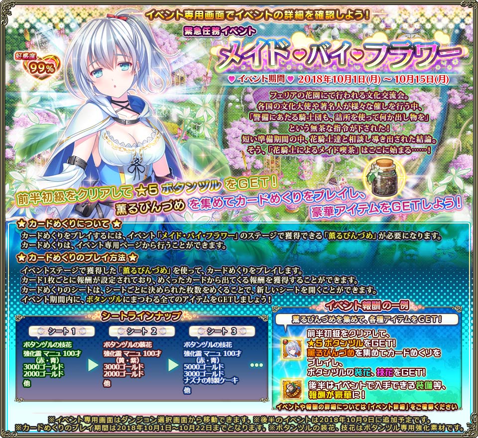 | 1 | 9枚 | 5枚目まで50個 6枚目以降100個 | 650個 | ボタンヅルの技花 | 前半 | | 2 | 9枚 | 650個 | ボタンヅルの装花 | | 3 | 16枚 | 1,350個 | ボタンヅルの技花 | | 4 | 16枚 | 1,350個 | 団長メダル×1 | | 5 | 25枚 | 2,250個 | ボタンヅルの装花 | | 6 | 25枚 | 2,250個 | ボタンヅルの技花 | | 7 | 36枚 | 3,350個 | ボタンヅルの装花 | | 8 | 36枚 | 3,350個 | ボタンヅルの技花 | | 9 | 36枚 | 5枚目まで100個 6枚目以降200個 | 6,700個 | プレミアムガチャチケット | | 10 | 36枚 | 6,700個 | ★4 薫りの指輪 | | 11 | 36枚 | 6,700個 | ★4 薫りの首飾り | | 12 | 36枚 | 6,700個 | 専用装備オキタエール(金) | | 13 | 36枚 | 6,700個 | ★4 薫りの耳飾り | 後半 | | 14 | 36枚 | 6,700個 | ★4 薫りの腕輪 | | 15 | 36枚 | 6,700個 | 専用装備オキタエール(金) | | 16 | 36枚 | 6,700個 | 20,000ゴールド | | 17 | 36枚 | 6,700個 | 20,000ゴールド | | 18 | 36枚 | 6,700個 | 20,000ゴールド | | 19 | 36枚 | 6,700個 | 20,000ゴールド | | おまけシート(前半) |