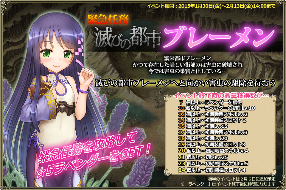 勲章報酬 スタミナ ゴールド ガチャ種 経験値(効率) 宝箱 備考 旧 華霊石x2/特別功労賞「銅」 30 ?~~? ?~~? 400 (13.333) 4 (★2or贈り物 1%) 復刻 ラベンダーの封印石x30 30 ?~~? ?~~? 400 (13.333) 4 (ラベンダーの封印石x21) 再復刻 ラベンダーの再封石x30 30 1397~1470 464~472 195 (6.500) 4 (ラベンダーの再封石x21)