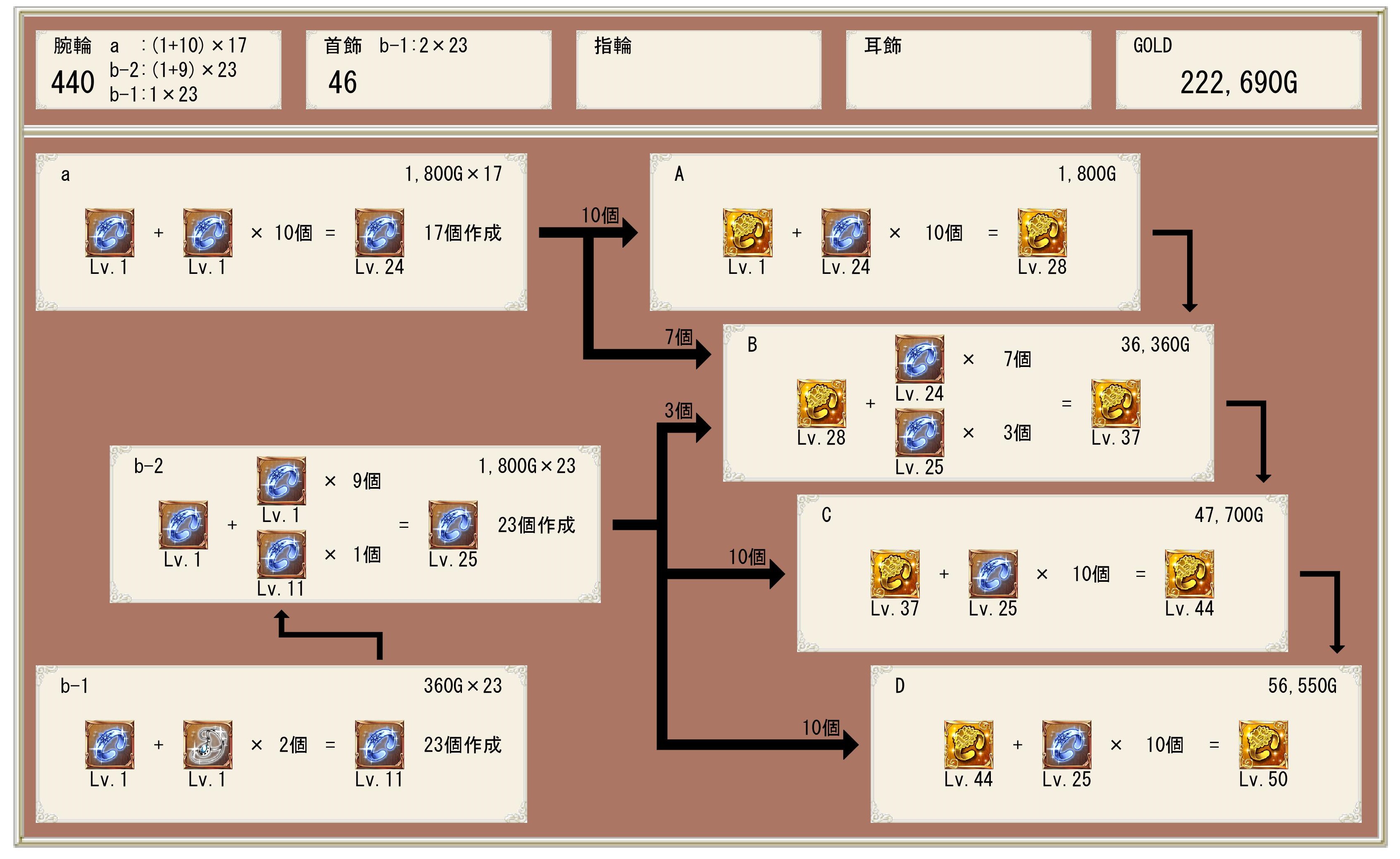 合成費用 素材Ax10=1800、素材Bx9=4860、素材Cx1=720 ベース合成=38160 計45540