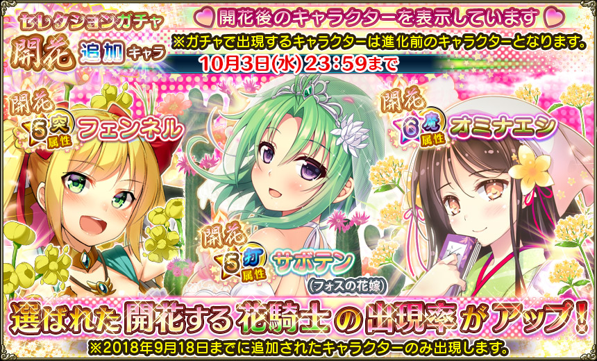 - 追加キャラ出現率アップガチャ :★5・★6を引いた時の追加キャラの出現率がアップ。開花Verあり。