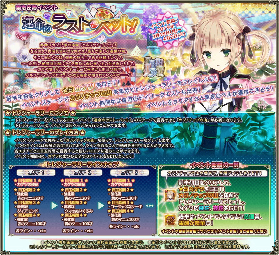 勲章報酬 スタミナ ゴールド ガチャ種 アビ育生の源(効率) 経験値(効率) 宝箱 備考 カゲツ/カゲツ(好感度99%) 10 ????~1644~???? ???~129~??? 11 (1.100) 110 (11.000) 2(★2or贈り物1%orマニュ5才) カジノチップの山×46