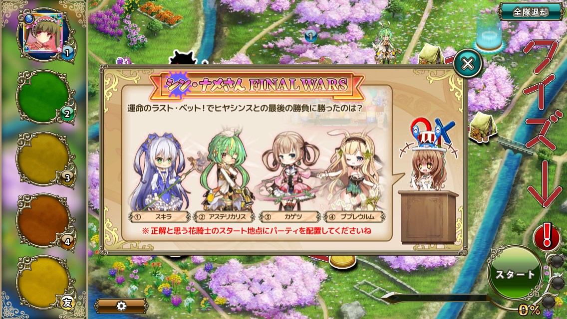 ![]() | 「大切なもの」 No.1 アルストロメリアの究極スパイス ストレプトカーパスのヒント 「「編成」に恐ろしく怪しい木が……ボクじゃなきゃ見逃しちゃうね。団長クン、ちょっと揺すってみてくれるかい?」 「大切なもの」の隠し場所 キャラ編成画面の右に怪しい木が出現しており、10回クリックするとラークスパーが悲鳴をあげて出現するので、これをクリック。 元ネタは花騎士4コマ劇場の第36話。→Twitterリンク |