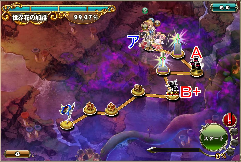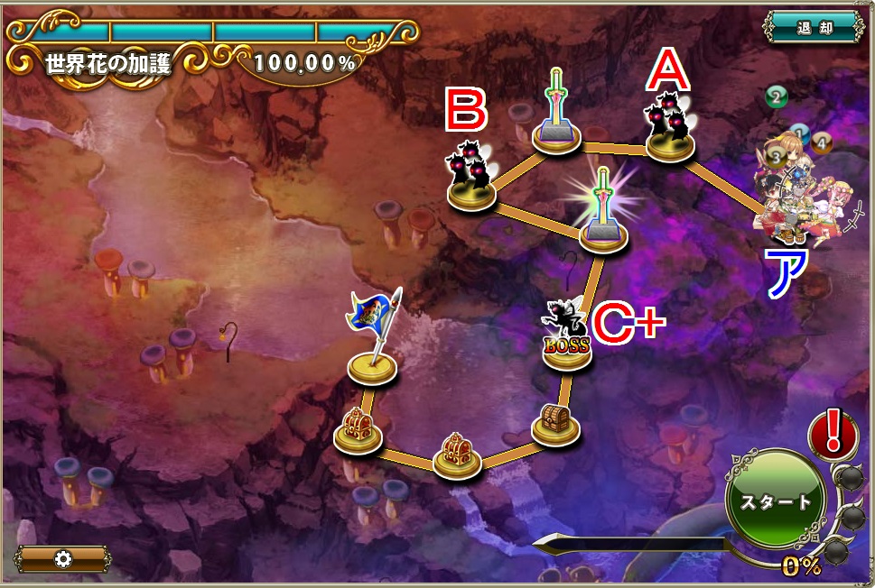 ソーラードライブで始末できると思われるが、どちらか一方しか対処できないので他方に対処するパーティは必要となる。- 移動力547の先行PTと移動力566の後発PTならAとB+は先行PTがC+は後発PTが戦闘する。