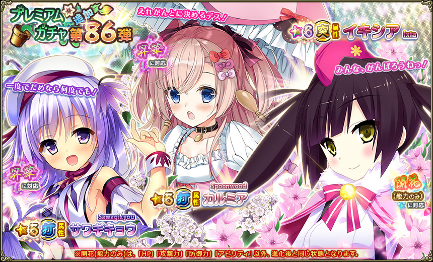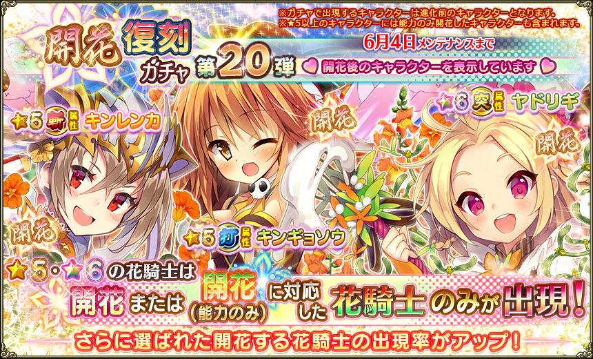 - 追加キャラ出現率アップガチャ :★5・★6を引いた時の追加キャラの出現率がアップ。開花Verあり。