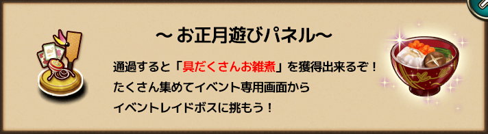 +1(生命の結晶×6)虎柄だるま×90、具だくさんお雑煮×15