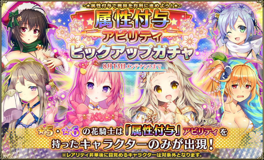- 追加キャラ出現率アップガチャ :★5・★6を引いた時の追加キャラの出現率がアップ。開花Verあり。