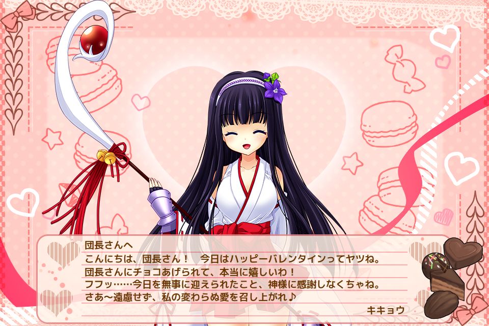 | 【期間限定】バレンタイン③ | 団長さんに、チョコレートを作ってきたわ。普段なら、神様に上手くできるようお願いするところんだけど…… それはしないで、私の気持ちだけで作ってみたの。その方が、伝わるものもあるのかなぁって……。ハッピーバレンタイン! |