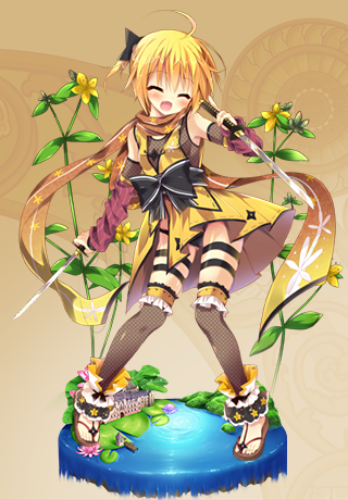 | 自己紹介 | 桃源郷から来たオトギリソウだよ! 自警団の忍として団長さんを監視していたはずが、 気付いたら団長さんの花騎士になっちゃってた ……まっ、いっか! 花言葉は「迷信」とか「秘密」とかだよ。 忍っぽくてかっこいいでしょ! | ||||||||||