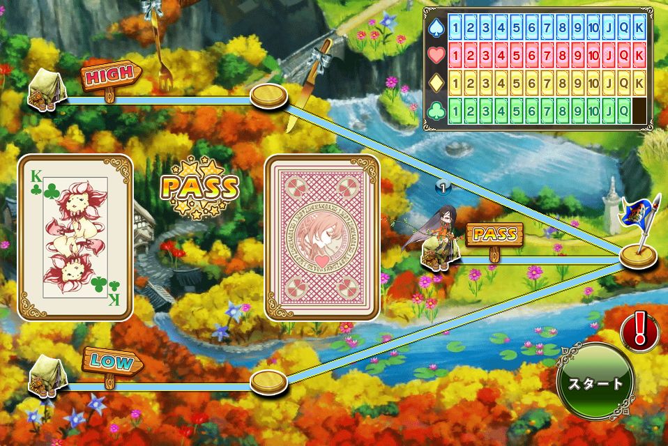 High & Lowは伏せカード(裏向きカード)が、表向きカードより大きいか小さいかを予想していくミニゲームです。