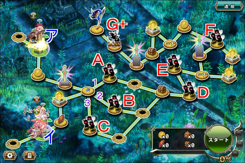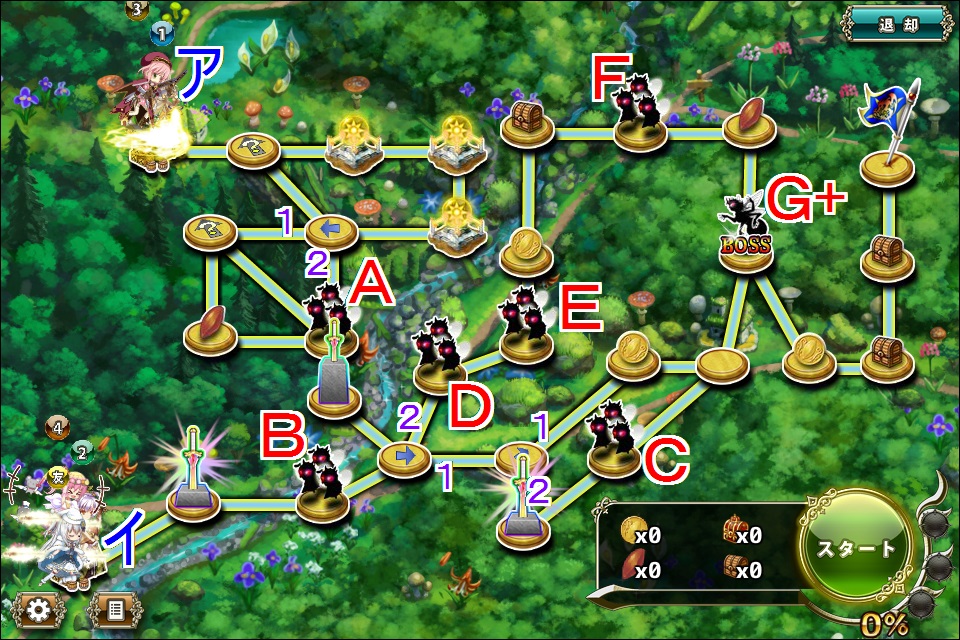 - 移動力560程度の第一部隊をイに配置、残りを移動力600台中盤~700程度でアに配置し、Aと接触出来るようにお祈り。