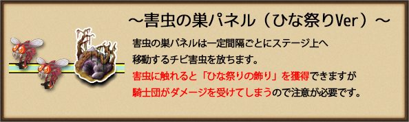 - 今回のイベントでは小バエとの衝突でもひな飾りを入手するため、害虫の巣のあるステージでは誤差が生じる。