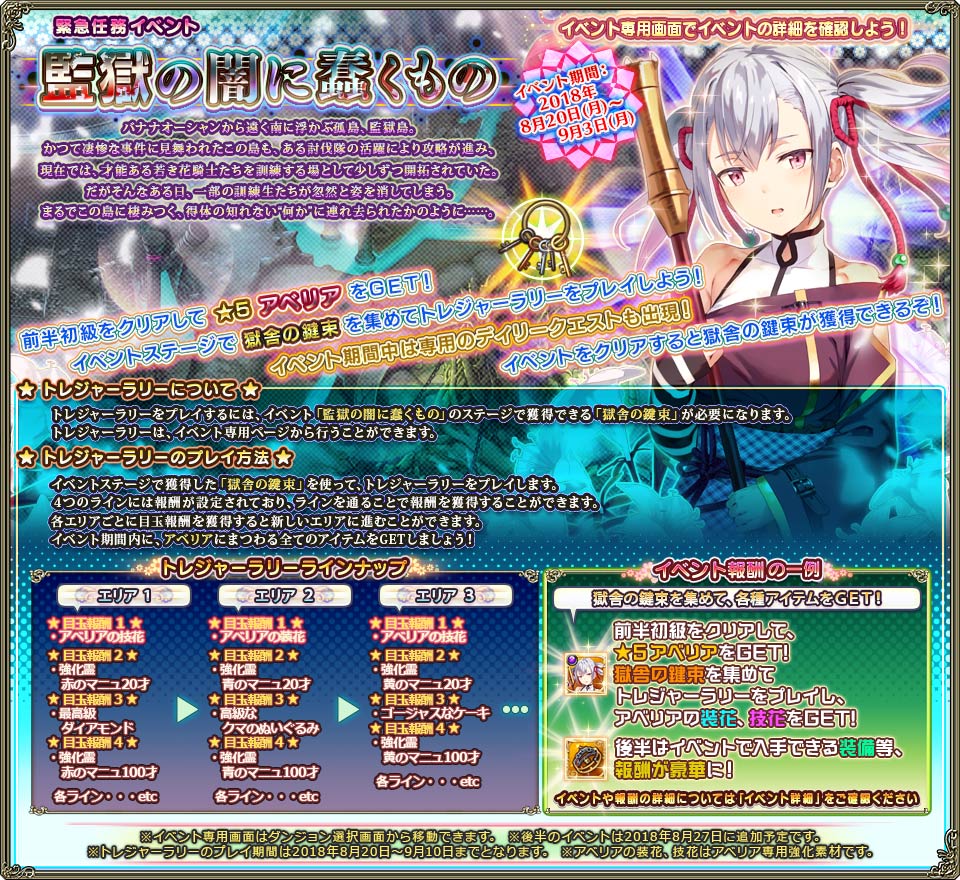 勲章報酬 スタミナ ゴールド ガチャ種 アビ育生の源(効率) 経験値(効率) 宝箱 備考 アベリア/アベリア(好感度99%) 10 ????~1613~???? ???~117~??? 11 (1.100) 110 (11.000) 2(★2or贈り物1%orマニュ5才) 獄舎の鍵束×46