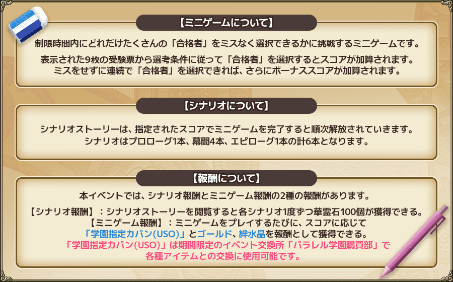 ※「学園指定カバン(USO)」は、期間限定のイベント交換所である「パラレル学園購買部」で使用可能な交換所通貨になります。