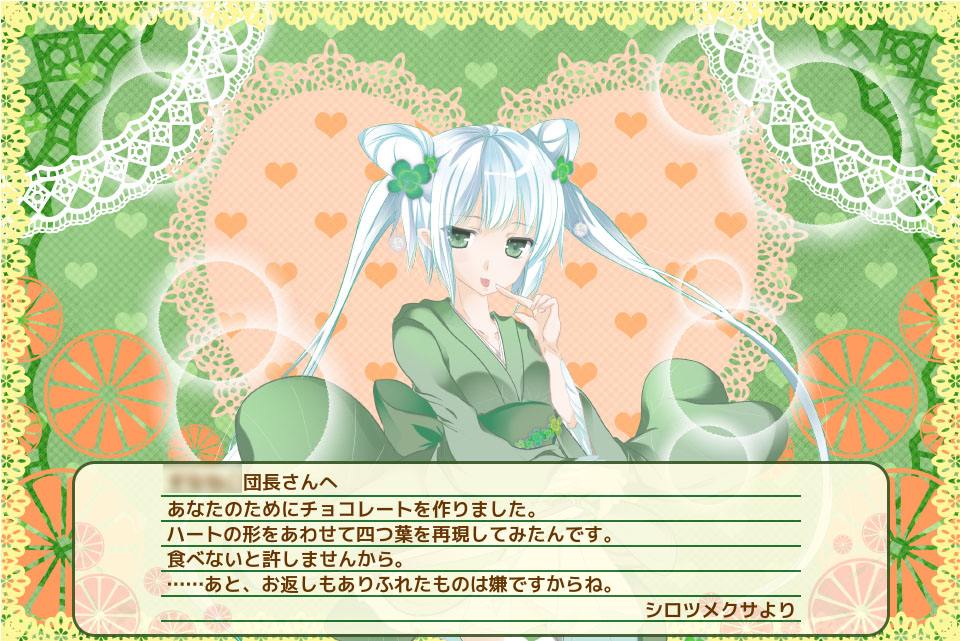| 【期間限定】バレンタイン③ | 目の下にクマがある?気のせいです。それより、あなたに受け取って欲しいものがあります。 ええ、このわたしがあなたをどう思っているか、形にして渡そうと思って。少々時間がかかってしまいました。 あなたは……わたしの、特別な……。 |