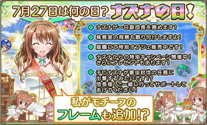 翌7月25日メンテナンス後より団長メダル1枚で『補佐団長ナズナ』を交換でき、『第1副団長』、『副団長』として指定できるようになった。