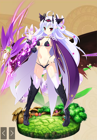 恰好はビキニにマントに鎧状のブーツ、頭には進化前は黒い猫耳、進化後は羊(夢魔?)のような角が生えている。コスチュームプレイ痴女の様だ。