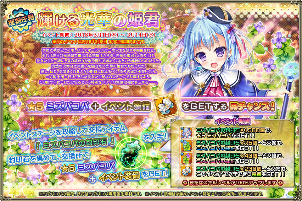 魔★6「カトレア(光華の姫君)」、突★5「アネモネ(光華の姫君)」、魔★5「シクラメン(光華の姫君)」、打★5「ミズバコパ」