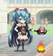 | 【期間限定】秋④ | ヒーちゃん、新メニューを研究中なの。 食欲の秋で食べ過ぎちゃった騎士団の娘達に痩せるキノコ料理を頼まれてるんだ。 ま、食べずに運動するのが一番効果的なんだけどね。 |