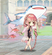 周囲にはなぜか空を飛ぶジンベエザメや魚たちが取り巻き、ジンベエザメは移動モーションでもサクラを乗せて飛んでいく。